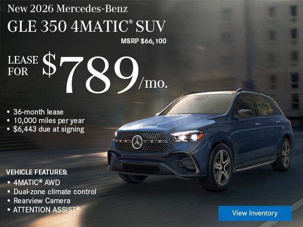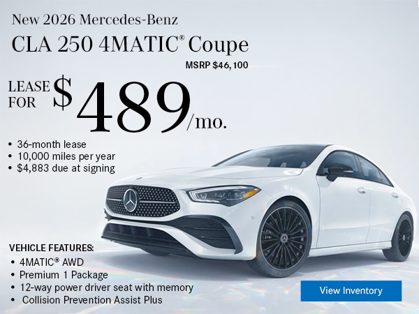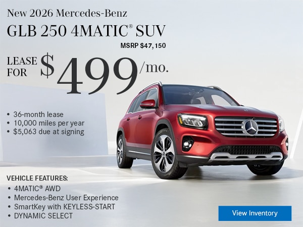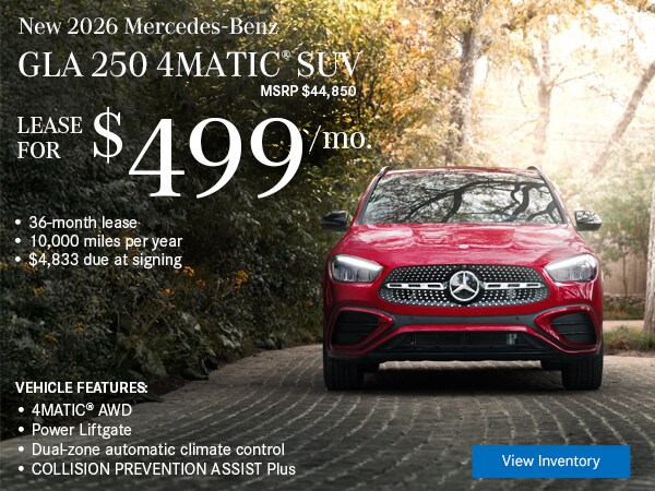 Available only to qualified customers through Mercedes-Benz Financial Services at participating authorized Mercedes-Benz dealers through March 31, 2026. Not everyone will qualify. Advertised 36 months lease payment based on MSRP of $44,850 less the suggested dealer contribution of $2,423 resulting in a total gross capitalized cost of $42,427. Dealer sets the final price. Dealer's contribution may vary and could affect your actual lease payment. Includes Destination Charge and optional. Excludes title, taxes, registration, license fees, insurance, dealer prep and additional options. Total monthly payments equal $17,964. Cash due at signing includes $3,339 capitalized cost reduction, $995 acquisition fee, and first month's lease payment of $499. Your acquisition fee may vary by dealership. The acquisition fee charged by the dealer may affect the total cash due at signing. No security deposit required. Total payments equal $22,298. At lease end, lessee pays for any amounts due under the lease, any official fees and taxes related to the scheduled termination, excess wear and use plus $0.25/mile over 30,000 miles and a $595 vehicle turn-in fee. Purchase option at lease end for $26,013 plus taxes (and any other fees and charges due under the applicable lease agreement) in example shown. Subject to credit approval. Specific vehicles are subject to availability and may have to be ordered. See participating dealer for details. Offer not valid in Puerto Rico.