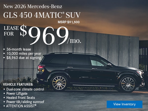 Available only to qualified customers through Mercedes-Benz Financial Services at participating authorized Mercedes-Benz dealers through October 31, 2025. Not everyone will qualify. Advertised 36 months lease payment based on MSRP of $91,500 less the suggested dealer contribution of $3,285 resulting in a total gross capitalized cost of $88,215. Dealer sets the final price. Dealer's contribution may vary and could affect your actual lease payment. Includes Destination Charge and optional. Excludes title, taxes, registration, license fees, insurance, dealer prep and additional options. Total monthly payments equal $34,844. Cash due at signing includes $6,999 capitalized cost reduction, $995 acquisition fee, and first month's lease payment of $969. Your acquisition fee may vary by dealership. The acquisition fee charged by the dealer may affect the total cash due at signing. No security deposit required. Total payments equal $42,838. At lease end, lessee pays for any amounts due under the lease, any official fees and taxes related to the scheduled termination, excess wear and use plus $0.25/mile over 30,000 miles and a $595 vehicle turn-in fee. Purchase option at lease end for $52,155 plus taxes (and any other fees and charges due under the applicable lease agreement) in example shown. Subject to credit approval. Specific vehicles are subject to availability and may have to be ordered. See participating dealer for details. Offer not valid in Puerto Rico.
