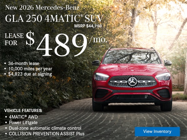 Available only to qualified customers through Mercedes-Benz Financial Services at participating authorized Mercedes-Benz dealers through March 2, 2026. Not everyone will qualify. Advertised 36 months lease payment based on MSRP of $44,750 less the suggested dealer contribution of $2,703 resulting in a total gross capitalized cost of $42,047. Dealer sets the final price. Dealer's contribution may vary and could affect your actual lease payment. Includes Destination Charge and optional. Excludes title, taxes, registration, license fees, insurance, dealer prep and additional options. Total monthly payments equal $17,604. Cash due at signing includes $3,339 capitalized cost reduction, $995 acquisition fee, and first month's lease payment of $489. Your acquisition fee may vary by dealership. The acquisition fee charged by the dealer may affect the total cash due at signing. No security deposit required. Total payments equal $21,938. At lease end, lessee pays for any amounts due under the lease, any official fees and taxes related to the scheduled termination, excess wear and use plus $0.25/mile over 30,000 miles and a $595 vehicle turn-in fee. Purchase option at lease end for $25,955 plus taxes (and any other fees and charges due under the applicable lease agreement) in example shown. Subject to credit approval. Specific vehicles are subject to availability and may have to be ordered. See participating dealer for details. Offer not valid in Puerto Rico.