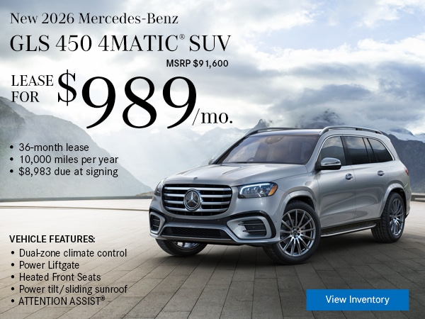 Available only to qualified customers through Mercedes-Benz Financial Services at participating authorized Mercedes-Benz dealers through March 31, 2026. Not everyone will qualify. Advertised 36 months lease payment based on MSRP of $91,600 less the suggested dealer contribution of $5,297 resulting in a total gross capitalized cost of $86,303. Dealer sets the final price. Dealer's contribution may vary and could affect your actual lease payment. Includes Destination Charge and optional. Excludes title, taxes, registration, license fees, insurance, dealer prep and additional options. Total monthly payments equal $35,604. Cash due at signing includes $6,999 capitalized cost reduction, $995 acquisition fee, and first month's lease payment of $969. Your acquisition fee may vary by dealership. The acquisition fee charged by the dealer may affect the total cash due at signing. No security deposit required. Total payments equal $43,598. At lease end, lessee pays for any amounts due under the lease, any official fees and taxes related to the scheduled termination, excess wear and use plus $0.25/mile over 30,000 miles and a $595 vehicle turn-in fee. Purchase option at lease end for $50,380 plus taxes (and any other fees and charges due under the applicable lease agreement) in example shown. Subject to credit approval. Specific vehicles are subject to availability and may have to be ordered. See participating dealer for details. Offer not valid in Puerto Rico.