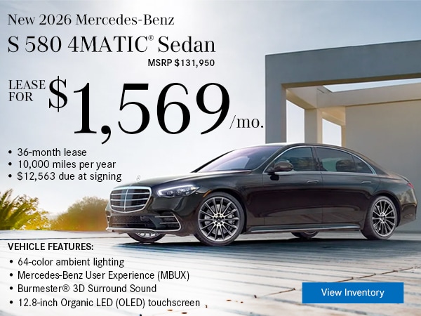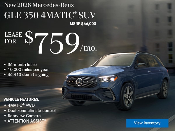 Available only to qualified customers through Mercedes-Benz Financial Services at participating authorized Mercedes-Benz dealers through March 2, 2026. Not everyone will qualify. Advertised 36 months lease payment based on MSRP of $67,650 less the suggested dealer contribution of $4,421 resulting in a total gross capitalized cost of $63,229. Dealer sets the final price. Dealer's contribution may vary and could affect your actual lease payment. Includes Destination Charge and optional. Excludes title, taxes, registration, license fees, insurance, dealer prep and additional options. Total monthly payments equal $27,684. Cash due at signing includes $5,099 capitalized cost reduction, $995 acquisition fee, and first month's lease payment of $769. Your acquisition fee may vary by dealership. The acquisition fee charged by the dealer may affect the total cash due at signing. No security deposit required. Total payments equal $33,778. At lease end, lessee pays for any amounts due under the lease, any official fees and taxes related to the scheduled termination, excess wear and use plus $0.25/mile over 30,000 miles and a $595 vehicle turn-in fee. Purchase option at lease end for $37,208 plus taxes (and any other fees and charges due under the applicable lease agreement) in example shown. Subject to credit approval. Specific vehicles are subject to availability and may have to be ordered. See participating dealer for details. Offer not valid in Puerto Rico.