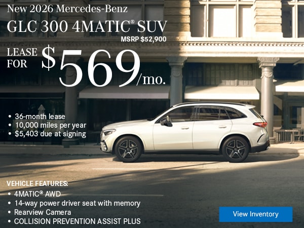 Available only to qualified customers through Mercedes-Benz Financial Services at participating authorized Mercedes-Benz dealers through March 31, 2026. Not everyone will qualify. Advertised 36 months lease payment based on MSRP of $47,150 less the suggested dealer contribution of $2,664 resulting in a total gross capitalized cost of $44,486. Dealer sets the final price. Dealer's contribution may vary and could affect your actual lease payment. Includes Destination Charge and optional. Excludes title, taxes, registration, license fees, insurance, dealer prep and additional options. Total monthly payments equal $17,964. Cash due at signing includes $3,569 capitalized cost reduction, $995 acquisition fee, and first month's lease payment of $499. Your acquisition fee may vary by dealership. The acquisition fee charged by the dealer may affect the total cash due at signing. No security deposit required. Total payments equal $22,528. At lease end, lessee pays for any amounts due under the lease, any official fees and taxes related to the scheduled termination, excess wear and use plus $0.25/mile over 30,000 miles and a $595 vehicle turn-in fee. Purchase option at lease end for $26,876 plus taxes (and any other fees and charges due under the applicable lease agreement) in example shown. Subject to credit approval. Specific vehicles are subject to availability and may have to be ordered. See participating dealer for details. Offer not valid in Puerto Rico.