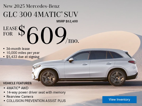 Available only to qualified customers through Mercedes-Benz Financial Services at participating authorized Mercedes-Benz dealers through October 31, 2025. Not everyone will qualify. Advertised 36 months lease payment based on MSRP of $52,400 less the suggested dealer contribution of $1,949 resulting in a total gross capitalized cost of $50,451. Dealer sets the final price. Dealer's contribution may vary and could affect your actual lease payment. Includes Destination Charge and optional. Excludes title, taxes, registration, license fees, insurance, dealer prep and additional options. Total monthly payments equal $21,924. Cash due at signing includes $3,829 capitalized cost reduction, $995 acquisition fee, and first month's lease payment of $609. Your acquisition fee may vary by dealership. The acquisition fee charged by the dealer may affect the total cash due at signing. No security deposit required. Total payments equal $26,748. At lease end, lessee pays for any amounts due under the lease, any official fees and taxes related to the scheduled termination, excess wear and use plus $0.25/mile over 30,000 miles and a $595 vehicle turn-in fee. Purchase option at lease end for $29,868 plus taxes (and any other fees and charges due under the applicable lease agreement) in example shown. Subject to credit approval. Specific vehicles are subject to availability and may have to be ordered. See participating dealer for details. Offer not valid in Puerto Rico.