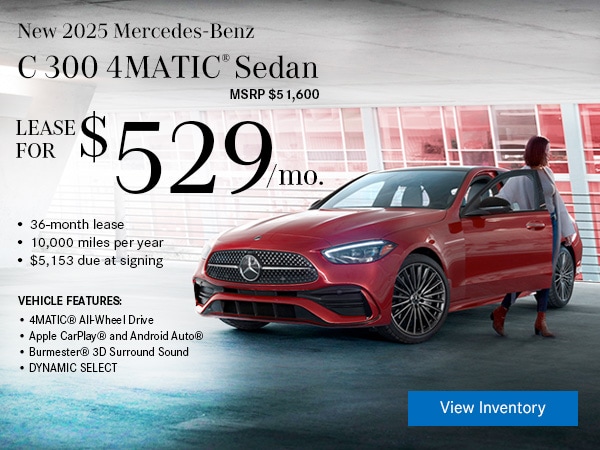 Available only to qualified customers through Mercedes-Benz Financial Services at participating authorized Mercedes-Benz dealers through October 31, 2025. Not everyone will qualify. Advertised 36 months lease payment based on MSRP of $47,550 less the suggested dealer contribution of $3,555 resulting in a total gross capitalized cost of $43,995. Dealer sets the final price. Dealer's contribution may vary and could affect your actual lease payment. Includes Destination Charge and optional. Excludes title, taxes, registration, license fees, insurance, dealer prep and additional options. Total monthly payments equal $17,244. Cash due at signing includes $3,569 capitalized cost reduction, $995 acquisition fee, and first month's lease payment of $479. Your acquisition fee may vary by dealership. The acquisition fee charged by the dealer may affect the total cash due at signing. No security deposit required. Total payments equal $21,808. At lease end, lessee pays for any amounts due under the lease, any official fees and taxes related to the scheduled termination, excess wear and use plus $0.25/mile over 30,000 miles and a $595 vehicle turn-in fee. Purchase option at lease end for $25,202 plus taxes (and any other fees and charges due under the applicable lease agreement) in example shown. Subject to credit approval. Specific vehicles are subject to availability and may have to be ordered. See participating dealer for details. Offer not valid in Puerto Rico.2025 C 300 4MATIC® Sedan