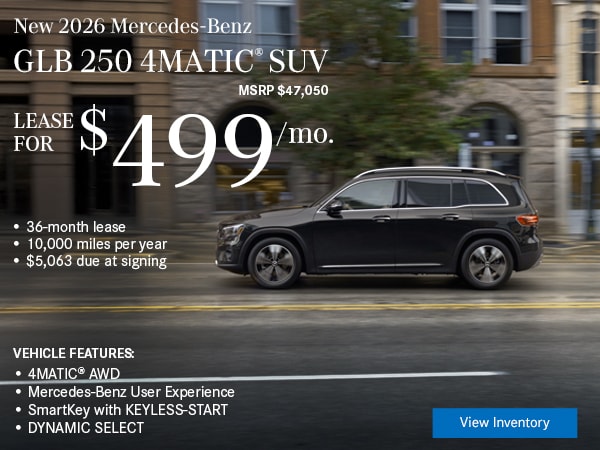 Available only to qualified customers through Mercedes-Benz Financial Services at participating authorized Mercedes-Benz dealers through March 2, 2026. Not everyone will qualify. Advertised 36 months lease payment based on MSRP of $47,050 less the suggested dealer contribution of $2,615 resulting in a total gross capitalized cost of $44,435. Dealer sets the final price. Dealer's contribution may vary and could affect your actual lease payment. Includes Destination Charge and optional. Excludes title, taxes, registration, license fees, insurance, dealer prep and additional options. Total monthly payments equal $17,964. Cash due at signing includes $3,569 capitalized cost reduction, $995 acquisition fee, and first month's lease payment of $499. Your acquisition fee may vary by dealership. The acquisition fee charged by the dealer may affect the total cash due at signing. No security deposit required. Total payments equal $22,528. At lease end, lessee pays for any amounts due under the lease, any official fees and taxes related to the scheduled termination, excess wear and use plus $0.25/mile over 30,000 miles and a $595 vehicle turn-in fee. Purchase option at lease end for $26,819 plus taxes (and any other fees and charges due under the applicable lease agreement) in example shown. Subject to credit approval. Specific vehicles are subject to availability and may have to be ordered. See participating dealer for details. Offer not valid in Puerto Rico.