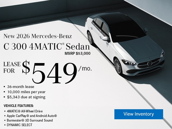 Available only to qualified customers through Mercedes-Benz Financial Services at participating authorized Mercedes-Benz dealers through March 31, 2026. Not everyone will qualify. Advertised 36 months lease payment based on MSRP of $53,000 less the suggested dealer contribution of $3,391 resulting in a total gross capitalized cost of $49,609. Dealer sets the final price. Dealer's contribution may vary and could affect your actual lease payment. Includes Destination Charge and optional. Excludes title, taxes, registration, license fees, insurance, dealer prep and additional options. Total monthly payments equal $19,764. Cash due at signing includes $3,799 capitalized cost reduction, $995 acquisition fee, and first month's lease payment of $549. Your acquisition fee may vary by dealership. The acquisition fee charged by the dealer may affect the total cash due at signing. No security deposit required. Total payments equal $24,558. At lease end, lessee pays for any amounts due under the lease, any official fees and taxes related to the scheduled termination, excess wear and use plus $0.25/mile over 30,000 miles and a $595 vehicle turn-in fee. Purchase option at lease end for $30,740 plus taxes (and any other fees and charges due under the applicable lease agreement) in example shown. Subject to credit approval. Specific vehicles are subject to availability and may have to be ordered. See participating dealer for details. Offer not valid in Puerto Rico.